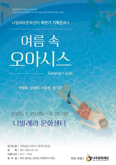 [뉴스스텝] 나주문화재단이 오는 7월 29일부터 8월 31일까지 나빌레라문화센터에서 하반기 첫 번째 기획전시 ‘여름 속 오아시스’를 개최하고 무더운 여름철 시민들에게 감각적 예술과 함께하는 특별한 휴식을 선사한다.