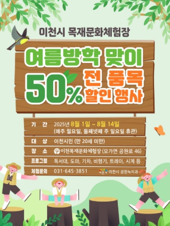 [뉴스스텝] 이천시는 여름방학을 맞아 어린이 및 청소년들에게 특별한 체험 기회를 제공하기 위해 목재문화체험장 이용료를 50%할인하는 행사를 진행한다고 밝혔다.