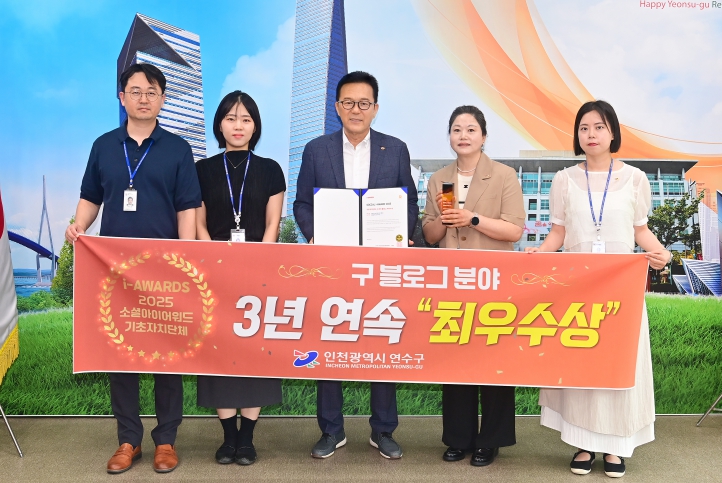 [뉴스스텝] 연수구가 25일 (사)한국인터넷전문가협회가 주최한 ‘소셜아이어워드 2025’에서 기초자치단체 분야(구) 블로그 부문에서 3년 연속 최우수상을 수상하는 쾌거를 올렸다.