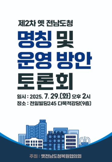 이번 토론회는 광주광역시, 문화체육관광부 옛전남도청복원추진단, 옛전남도청복원범시도민대책위원회로 구성된 옛전남도청복원협의회가 공동 주최하며, 5·18민주화운동의 최후 항쟁지인 옛 전남도청의 의미를 되새기고 복원 건물의 공식 명칭과 향후 운영 방향을 시민과 함께 고민하는 자리로 마련됐다.