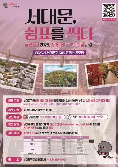 응모 기간은 이달 15일부터 다음 달 17일 오후 6시까지며 주제는 ‘서대문, 쉼표를 찍다 - 서대문 속 자연과 일상에서 발견한 쉼의 순간’이다.