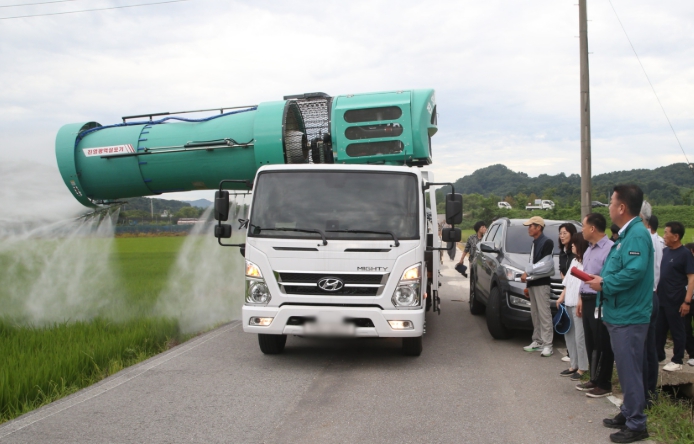 이날 작업에는 시가 스마트농기계 공급지원 사업을 통해 보급한 광역방제기가 활용됐으며, 이 시장은 장비의 실효성과 개선사항을 꼼꼼히 점검하고 현장의 목소리를 경청했다.