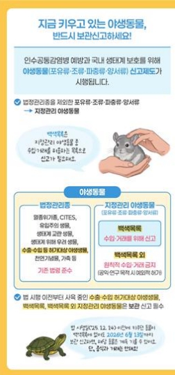 또한, 개인적으로 키우는 주민들은 수출·수입 등 허가대상 야생동물, 백색목록, 백색목록 외 지정관리 야생동물에 대해 보관, 양도·양수, 폐사 등을 신고하여야 한다.