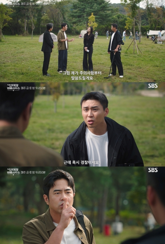 연쇄 아동 실종 사건을 수사하는데 단 4명만이 모인 비밀 수색 현장. 신이랑의 부재가 눈에 띄는 가운데, 비번까지 반납하고 달려온 김순경과 “주 안에서 불가능은 없다”며 전의를 불태우는 마태오, 그리고 평소보다 진지해진 윤봉수의 리드가 눈길을 끈다. 윤봉수는 “사체가 매장된 곳은 유기물 때문에 식물 성장이 다르다”며 다년의 단역생활로 쌓은 전문적 지식을 뽐내는가 하면, 금속 탐지기 앱을 활용해 단추나 지퍼 하나도 놓치지 말 것을 당부한다.