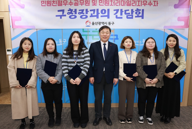 동구는 이날 간담회에서 친절 우수 공무원을 격려하고 민원 업무 처리에 있어 고충 및 건의 사항 청취, 악성 민원 발생 시 대응 방법 상호 공유, 피해 공무원 보호 방안에 대한 의견 교환 등 간담회 시간을 가졌다.