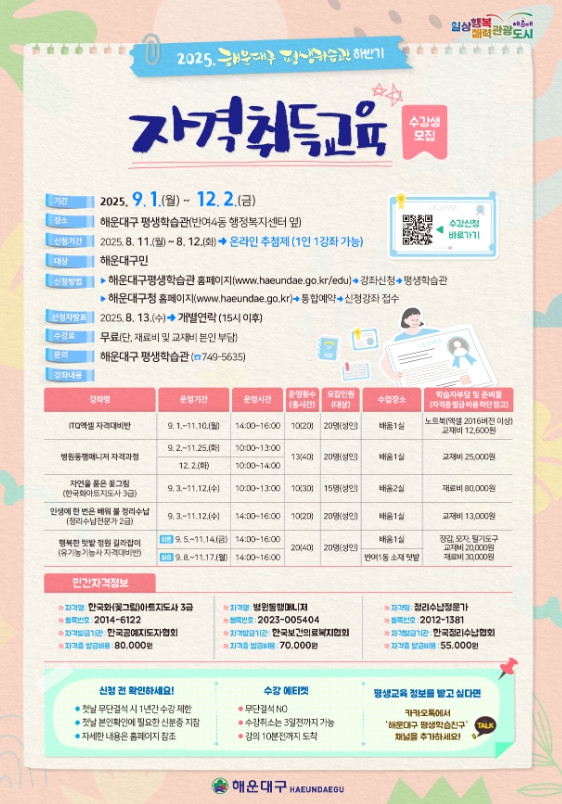 ▲ 해운대구, 2025년 하반기 평생학습관 자격취득교육 수강생 모집 |