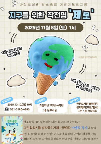 [뉴스스텝] 김포시 마산도서관에서 오는 11월 8일 오후 1시부터 3시까지, 초등학교 2학년~4학년 어린이를 대상으로 탄소중립 어린이 프로그램 책풍당당 '지구를 위한 작전명 ‘제로’'를 운영한다.