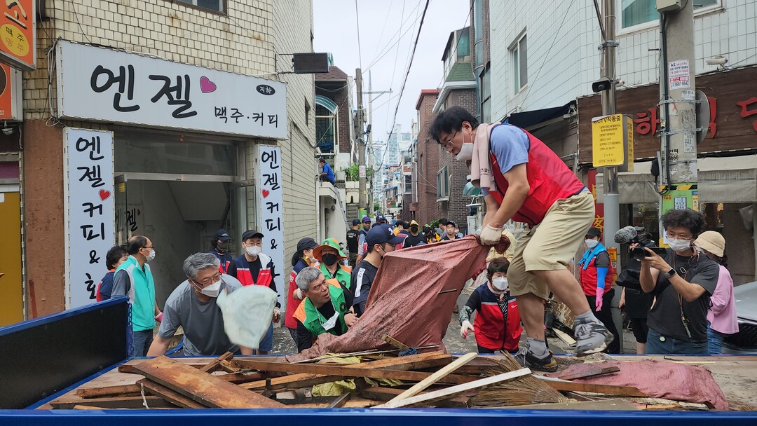 ▲ 군포시 산본1동에서 자원봉사자들이 물에 젖은 가구를 옮기며 수해복구 자원봉사 활동이 진행되고 있다. [사진제공=한국중앙자원봉사센터] |