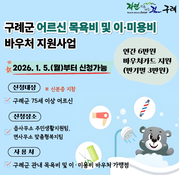 [뉴스스텝] 구례군은 75세 이상 어르신들의 건강하고 활기찬 노후생활 보장과 지역경제 활성화를 도모하기 위해 '어르신 목욕비 및 이·미용비 바우처 지원사업'을 본격 추진한다고 밝혔다.