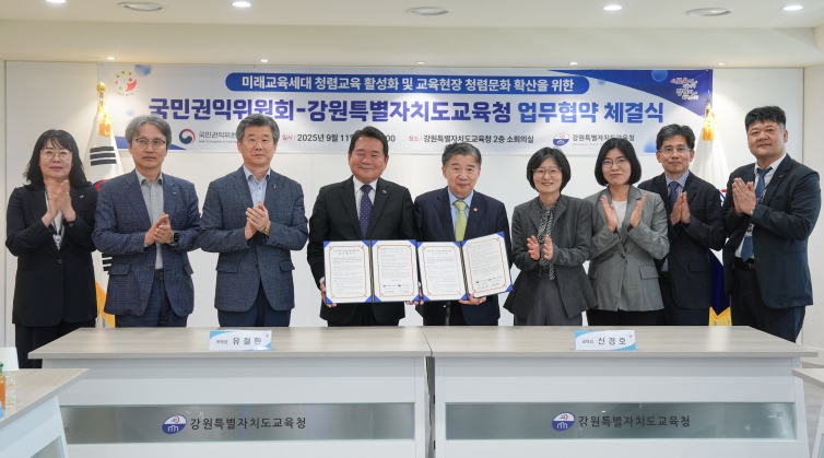 [뉴스스텝] 강원특별자치도교육청(교육감 신경호)과 국민권익위원회는 9월 11일 오후 2시, 도교육청 2층 소회의실에서 청렴인재 양성 및 교육현장 청렴문화 확산을 위한 업무협약(MOU)을 체결했다.