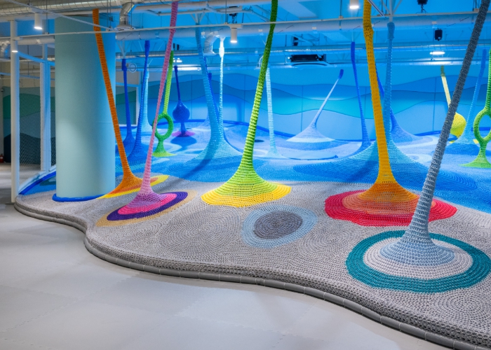 ‘갯벌놀이터’는 갯벌의 생태적 요소와 환경적 특성을 바탕으로, 그물 구조를 예술적으로 구현한 비정형 놀이시설이 특징이다. 공간 자체가 하나의 예술적 체험으로 작동하며, 어린이들이 갯벌의 역동성과 생명력을 몸으로 느끼고 탐험할 수 있도록 설계됐다. ‘갯벌책방’은 약 2,000권 규모의 서가를 갖춘 자율 운영 독서 공간으로, 놀이와 독서를 함께 즐길 수 있는 열린 문화공간이다. 경기문화재단 임직원, 지역 주민, 경기도 내 출판사 등의 자발적인 도서 기증으로 서가가 채워지며, 기증자에게는 경기문화재단 기부캠페인 ‘문화이음’을 통한 기부 혜택이 제공된다. ‘갯벌마당’은 탄성 고무칩 바닥에 다양한 색상과 형태의 패턴이 조성된 야외 놀이터로, 어린이들이 즐기는 야외 마당 놀이(멀리뛰기, 사방치기, 원마커 등)를 할 수 있도록 구성되어 있으며 자유로운 신체 활동이 가능하다. 인근 테라스에는 인조잔디와 야외용 테이블·의자가 마련되어 있어 보호자들이 아이들을 가까이에서 지켜보며 휴식을 취할 수 있다.