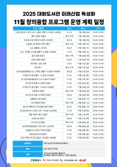 총 28개 과정으로 구성돼 있으며, 대표적인 프로그램으로는 ▲인공지능으로 나만의 로고 스탬프 만들기 (11월 18일) ▲슈링클스로 캐릭터 키링 만들기(11월 19일) ▲나만의 웹툰 만들기(11월 20일) ▲3D프린터 장비 교육(11월 21일) ▲아크릴 무드등 만들기(11월 22일) ▲AI클로바 더빙 만들기(11월 26일) ▲유니맷으로 DIY 나만의 샤프(11월 27일) ▲DIY 머그컵 만들기(11월 28일) ▲마퀸으로 RC카 만들기 등이 있다.