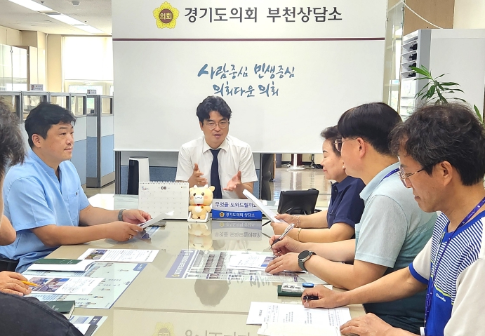 [뉴스스텝] 경기도의회 박상현 의원(더불어민주당, 부천8)은 26일 부천상담소에서 부천시 오정구에 건립 예정인 택시복지센터 주변 주차난 해소를 위해 부천시 구점자, 손준기 시의원, 부천시 대중교통과, 주차정책과, 택시화물팀, 주차정택팀 등 실무자들이 머리를 맞댔다.