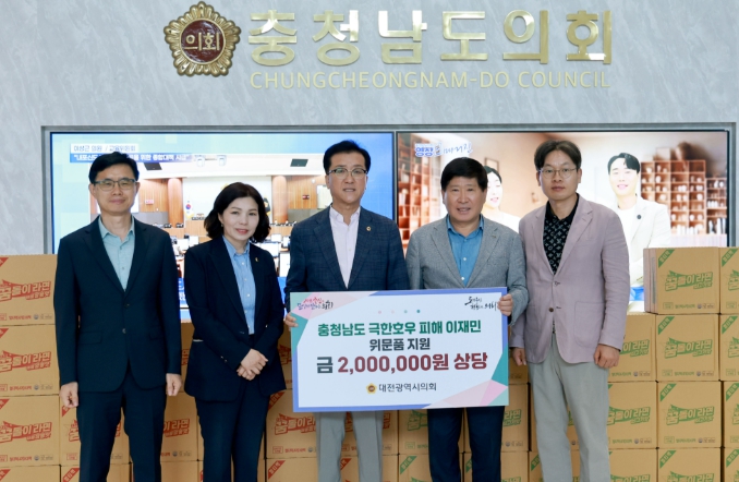이번 전달식에는 조원휘 대전시의회 의장을 비롯해 홍성현 충청남도의회 의장 등 양 의회 주요 인사들이 참석했으며, 대전시의회가 위문품으로 전달한 꿈돌이라면 40박스(200만 원 상당)는 극한호우로 피해를 당한 주민들에게 지원될 예정이다.