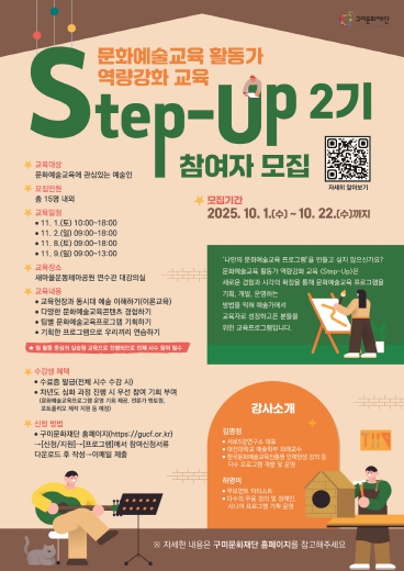 [뉴스스텝] (재)구미문화재단은 문화예술교육 활동가 역량강화 교육 프로그램 'Step-Up' 2기 참여자를 오는 10월 1일부터 22일까지 모집한다고 밝혔다.