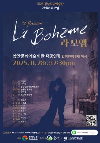 [뉴스스텝] 함안군은 푸치니의 대표작 오페라 〈라 보엠〉을 오는 2025년 11월 28일 오후 7시 30분, 함안문화예술회관 대공연장에서 전석 무료로 선보인다고 밝혔다.