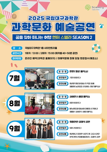 또한, 과학문화예술 공연으로 7월 19일 ‘펀펀 벌룬 매직쇼’, 8월 16일 ‘사이언스 버블 매직쇼’, 9월 20일 ‘휘황찬란 클래식 공연’을 국립대구과학관 사이언트리홀에서 개최한다.