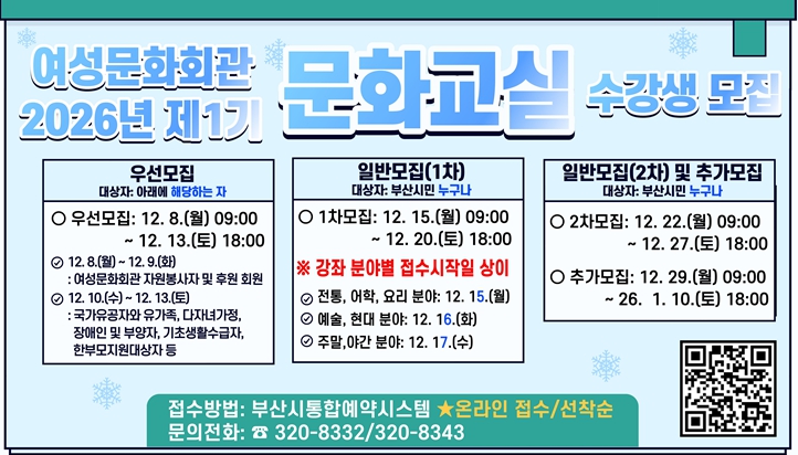 [뉴스스텝] 부산시 여성문화회관은 오는 내일(8일)부터 '2026년 제1기 문화교실' 수강생을 모집한다고 밝혔다.