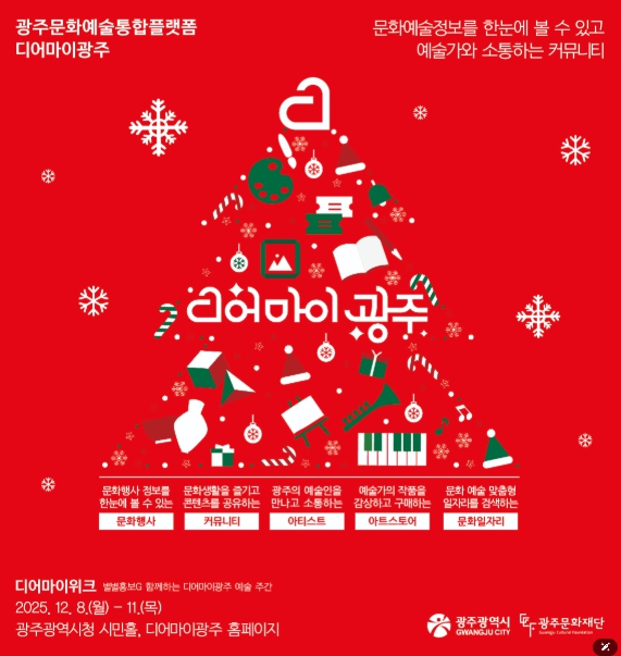 [뉴스스텝] 광주문화예술통합플랫폼 ‘디어마이광주’의 오프라인 축제 ‘디어마이위크’가 12월 8일부터 11일까지 광주광역시청 1층 로비에서 열린다. 올해 축제는 광주광역시 홍보 성과 공유회 ‘2025 별별홍보G’와 연계하여, 문화예술을 기반으로 한 새로운 지역 홍보 모델을 제시하는 데 의미를 두고 있다.