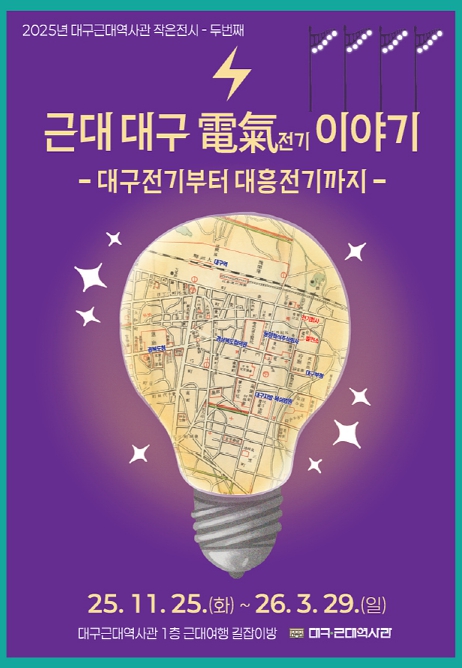 [뉴스스텝] ( 재)대구문화예술진흥원 박물관운영본부 소속 대구근대역사관은 전기(電氣)로 근대 대구사회의 일면을 살펴보는 ‘근대 대구 電氣전기 이야기 –대구전기부터 대흥전기까지-’ 작은전시를 11월 25일부터 2026년 3월 29일까지 1층 대구 근대여행 길잡이방에서 개최한다.
