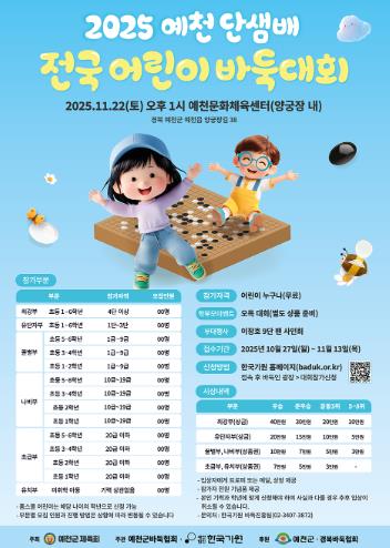 예천군체육회가 주최하고 (재)한국기원과 예천군바둑협회가 주관하는 이번 대회는 전국의 어린 바둑 인재 350여 명과 심판·관계자, 학부모 등 총 1,000여 명이 참가하여 바둑 열기로 대회장을 가득 메울 전망이다.