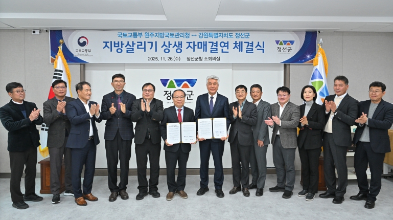 [뉴스스텝] 정선군은 11월 26일 정선군청에서 국토교통부 원주지방국토관리청(청장 이동민)과 ‘지방살리기 상생 자매결연 업무협약’을 체결했다고 밝혔다.