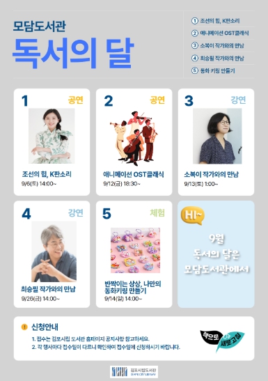 모담도서관은 오는 9월 독서의 달을 맞이하여 시민들의 독서, 문화, 예술적 욕구를 충족시키기 위한 다양한 프로그램 등을 기획하고 있다. 한류의 창의성을 품은 판소리 이야기 ▲조선의 힙, 케이(K)-판소리 강연, ▲애니메이션 삽입곡 클래식 공연, ▲소복이 작가와의 만남, ▲‘다시, 공부머리 독서법’ 최승필 작가 강연, ▲반짝이는 상상, 나만의 동화 키링 만들기 체험과 ▲다양한 전시가 진행될 예정이다.