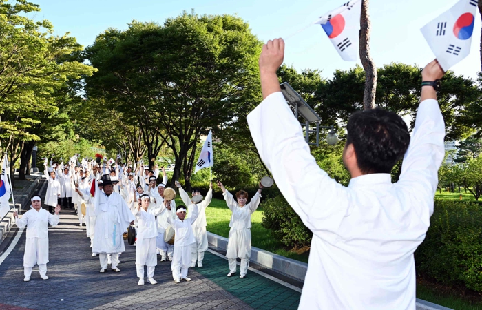 ▲ - 지난 15일 밀양아리랑아트센터 소공연장에서 개최된 제80주년 광복절 기념식 및 문화공연 참석자들이 길놀이 행진 중‘대한독립 만세’를 외치고 있다. |
