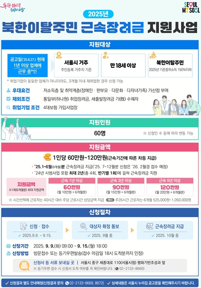 ’25년 상반기 북한이탈주민 근속장려금 지원 대상자 모집 안내를 8월 29일부터 시행할 예정이며, 자세한 사항은 서울시 홈페이지 고시‧공고란, 카카오톡 채널 등을 통해 확인이 가능하다.