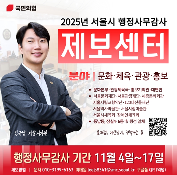 [뉴스스텝] 김규남 서울시의원(송파1·국민의힘)은 오는 11월 4일부터 17일까지 열리는 2025년도 서울시 행정사무감사를 앞두고 시민 참여를 위한 제보센터를 운영한다고 30일 밝혔다.