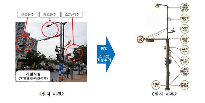 또 기존에 CCTV․신호등․가로등 등을 각각 설치하던 방식과 달리 여러 시설물을 하나의 지주로 통합하면서 전력․통신 인입공사 통합, 기초․배선 공정 축소, 중복 설치된 시설물 제거 등으로 평균 23%의 시설물 설치비도 절감된 것으로 나타났다.