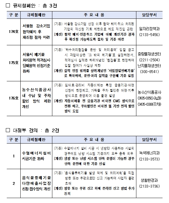 시는 자체적으로 개선 가능한 ▴서울형 강소기업 협약해지 후 재신청 절차 마련(174호) ▴서울시 폐기물 처리용역 적격심사 당해용역 인정기준 완화(175호) ▴농수산식품공사 내 수납 및 주차할인 방식 제한 개선(176호) 과제는 정비하고, ▴수열에너지 설비 시공기준 완화, ▴음식물류폐기물 다량배출사업장 신청․접수방식 개선 등 2건은 정부에 공식 건의했다.