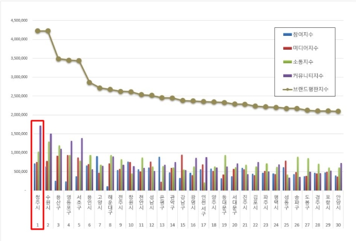 청주시는 △참여지수 718,537 △미디어지수 758,600 △소통지수 1,030,780 △커뮤니티지수 1,717,444로 총합 4,225,361을 기록했다.