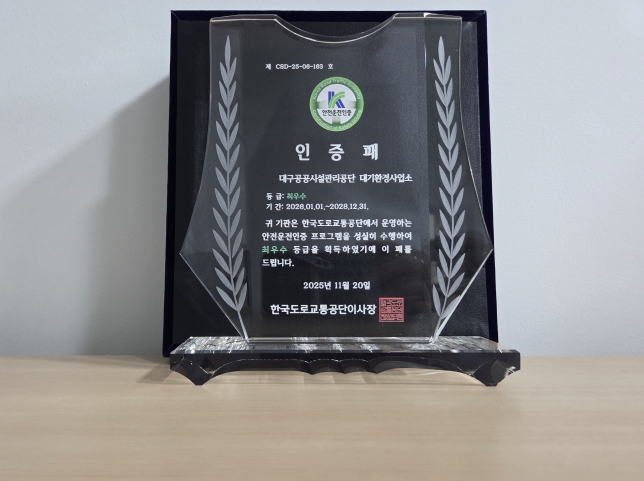 [뉴스스텝] 대구공공시설관리공단(이사장 문기봉) 대기환경사업소는 지난 20일 한국도로교통공단에서 시행된 ‘안전운전인증’ 심의 결과, 11월 26일 최우수 등급으로 인정받았다.