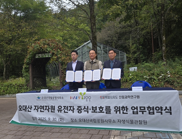 [뉴스스텝] 강원특별자치도 산림과학연구원은 9월 30일 국립공원공단 오대산국립공원사무소, 평창군과 우수 산림 유전자원 보존을 위한 업무협약을 체결하고, 오대산국립공원 내 보호수로 지정된 잎갈나무의 후계목을 육성하고 있다고 밝혔다.