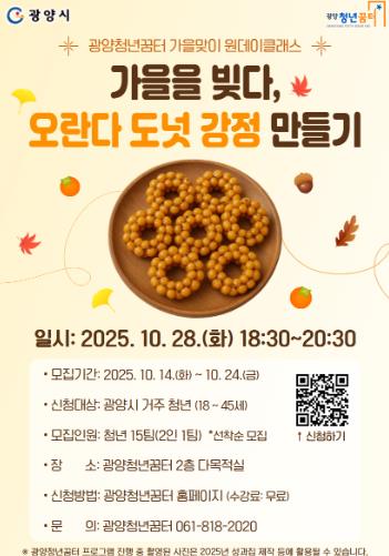 [뉴스스텝] 광양시는 청년들의 여가문화 활성화와 정서적 힐링을 위한 프로그램의 일환으로, 광양청년꿈터에서 가을맞이 원데이클래스 ‘가을을 빚다 – 오란다 도넛 강정 만들기’ 참가자를 모집한다고 14일 밝혔다.