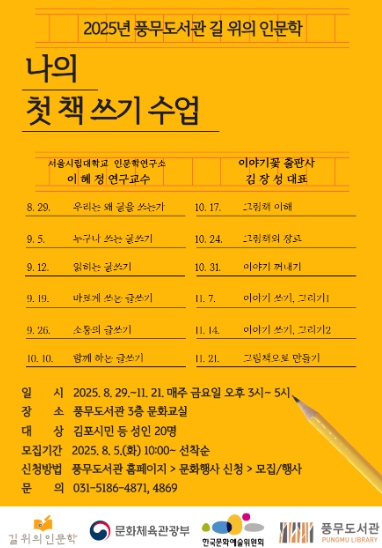 [뉴스스텝] 김포시 풍무도서관은 8월 29일부터 11월 21일까지 매주 금요일 오후 3시에 2025년 길 위의 인문학 ‘나의 첫 책 쓰기 수업’(총 12회)을 운영한다.