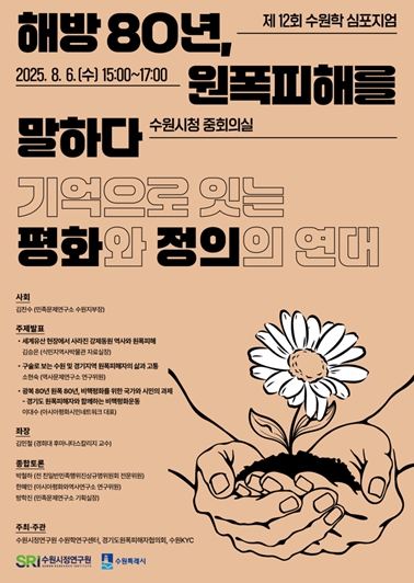 [뉴스스텝] 수원시정연구원은 수원시와 공동으로 ‘해방 80년, 원폭피해를 말하다-기억으로 잇는 평화와 정의의 연대’를 주제로 제12회 수원학 심포지엄을 개최한다고 25일 밝혔다. 행사는 오는 8월 6일 오후 3시부터 5시까지 수원시청 중회의실에서 진행된다.