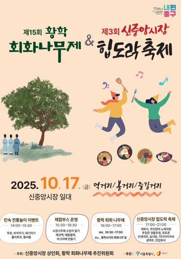 [뉴스스텝] 서울 중구 황학동의 오랜 전통을 품은‘황학회화나무제’와 젊은 감각이 살아 있는‘신중앙시장 힙도락(HIP:道樂) 축제’가 오는 17일 오후 2시에 함께 열린다. 두 축제는 2023년부터 연계 개최해, 황학동의 가을을 더욱 풍성히 채우고 있다.