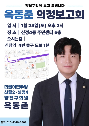 [뉴스스텝] 양천구의회 옥동준 의원(더불어민주당, 신정4·신월2동)이 오는 24일 오후 2시 양천구 신정4동 주민센터에서 의정보고회를 열어 그간의 의정활동 성과와 향후 계획을 양천구민께 보고하는 자리를 마련한다.