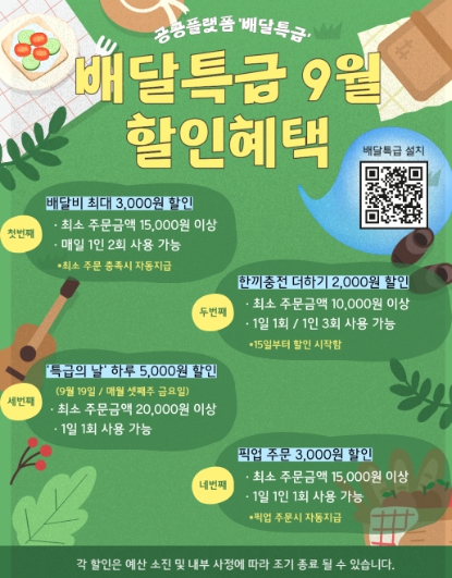 센터에 따르면 9월 할인 혜택은 ▲‘배달비 지원’최대 3,000원 할인 쿠폰 ▲‘픽업 주문 지원’3,000원 할인 쿠폰 ▲ 9월 셋째 주 금요일(9.19.) ‘부천시 특급의 날’ 5,000원 할인 쿠폰 ▲ 9월 15일부터 9월 30일까지 진행되는‘한 끼 충전’ 더하기 2,000원 할인 쿠폰이 제공된다. 특히 더하기 쿠폰은 다른 쿠폰과 중복 사용이 가능하여 혜택이 더욱 크다.