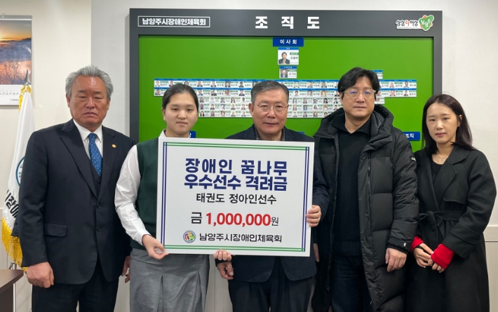 이날 행사에서 손기남 남양주시장애인체육회 수석부회장이 장애인태권도 국가대표 정아인 선수에게 직접 격려금을 전달했다. 전달식에는 윤성한 남양주시장애인태권도협회장을 비롯한 관계자와 선수 가족이 함께 참석해 의미를 더했다.