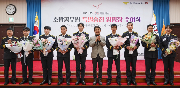 [뉴스스텝] 강원특별자치도는 12월 3일 도청 신관 대회의실에서 도민의 생명과 안전을 지키는 데 헌신한 우수 소방공무원 8명에 대해 특별승진 임용장 수여식을 개최했다고 밝혔다.