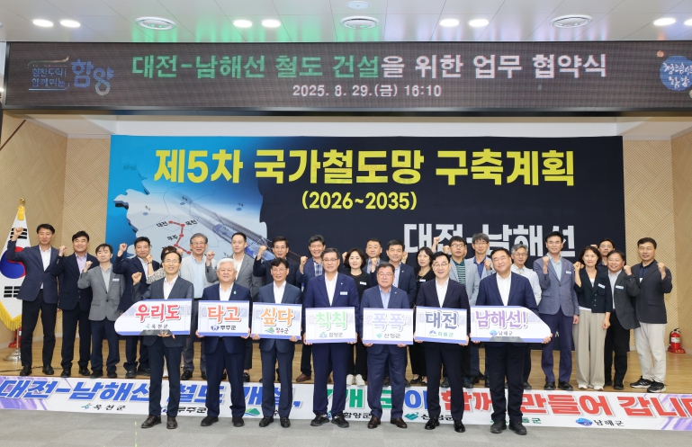 협약안에는 △철도 건설사업의 필요성과 타당성 확보를 위한 공동 연구 및 자료 공유, △지역개발 관광 활성화 후속 사업과의 연계 방안 모색 등 대전~남해선 철도 사업이 국토교통부에서 수립 중인 제5차 국가철도망 구축계획(2026~2035년)에 반영될 수 있도록 공동 대응한다는 내용이 담겼다.