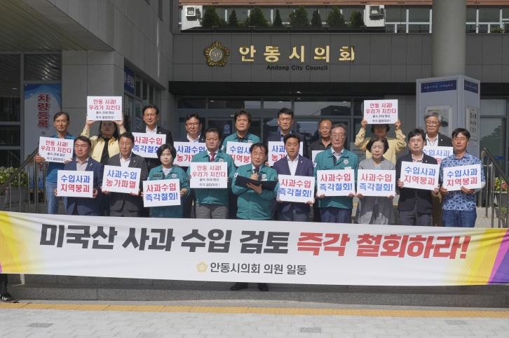 안동시의회는 성명서에서 “정부가 미국산 사과 수입 검토 소식은 사과 주산지인 안동을 비롯한 지역 농가에 큰 충격과 실망을 안겨주고 있다”라며, “이는 단순한 경제 문제를 넘어 지역 농업의 근간을 흔들고 농가 생존권을 심각하게 위협하는 중대한 사안”이라고 지적했다.