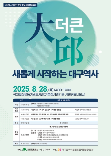 기조발표는 △이정우 경북대 명예교수가 맡아 지역사와 시사 편찬의 중요성을 짚는다. 주제 발표에서는 △박명호 서울역사편찬원 시사편찬과장이 ‘서울 지역사 편찬 사례’를 통해 대구의 시사 편찬 방향을 조망하고, △김경남 경북대 교수가 ‘디지털시대 공공역사와 대구형 시사편찬 전략’을 발표한다.