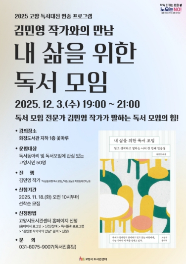 [뉴스스텝] 고양특례시는 오는 12월 3일 오후 7시, 화정도서관 지하 1층 꽃마루에서 독서모임 분야 전문가인 김민영 작가를 초청해 ‘김민영 작가와의 만남: 내 삶을 위한 독서 모임’프로그램을 운영한다고 밝혔다.