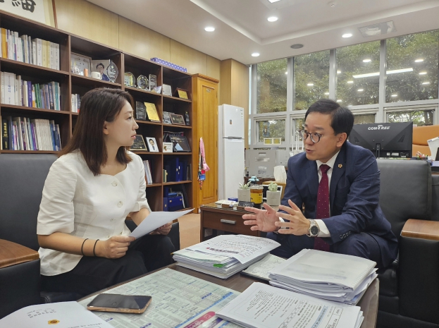 ▲ 부산시의회에서 정초립 의원(좌)과 김형철 의원(우)이 웰니스 정책에 대해 논의하고 있다. |