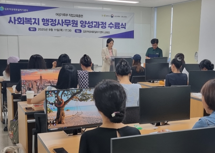 [뉴스스텝] 김포시는 9월 11일 김포여성새로일하기센터에서 '사회복지 행정사무원 양성과정' 수료식을 개최했다. 이날 행사에는 강사와 훈련생 등 20여 명이 참석했으며, 이번 과정은 교육생 20명 전원이 한 명도 탈락 없이 수료하는 성과를 거뒀다.