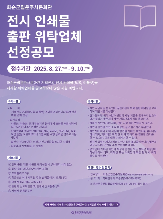 [뉴스스텝] 전남 화순군은 28일 화순군립운주사문화관 기획전 ‘스며들고 피어나다’展 전시 내용을 담은 인쇄물 제작을 위해 출판 전문업체를 모집한다고 밝혔다.
